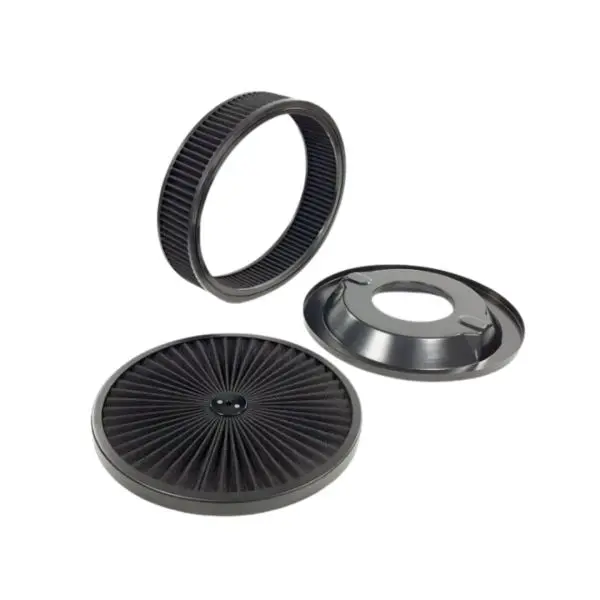 Anodized Trim, Anodized Base, Black Element. Fits carburettors and TBI throttle bodies with 5-1/8 inlet. 14 by 2-inch tall assembly with extra flow filter lid.